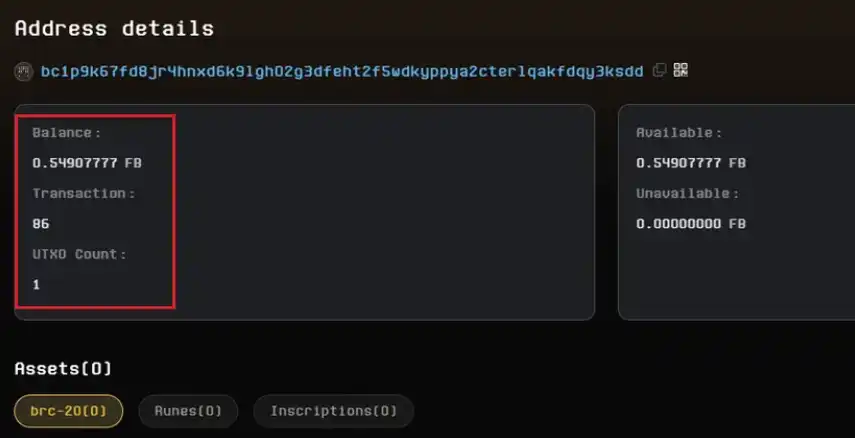 ⑥ 如果把创建的钱包助记词导入 unisat 钱包会因为格式问题导致地址对不上,所以不用导入,直接在区块浏览器输入新生成的钱包地址查看 FB 余额 和 打上的资产就行 https://explorer.unisat.io/fractal-mainnet/address/bc1p9k67fd8jr4hnxd6k9lgh02g3dfeht2f5wdkyppya2cterlqakfdqy3ksdd