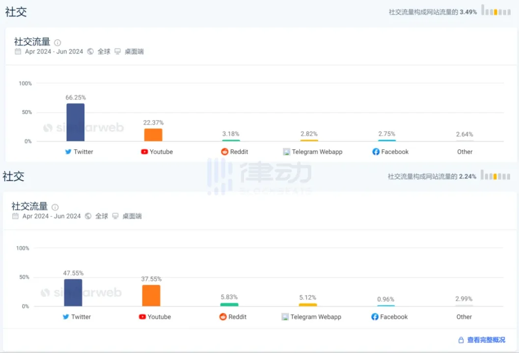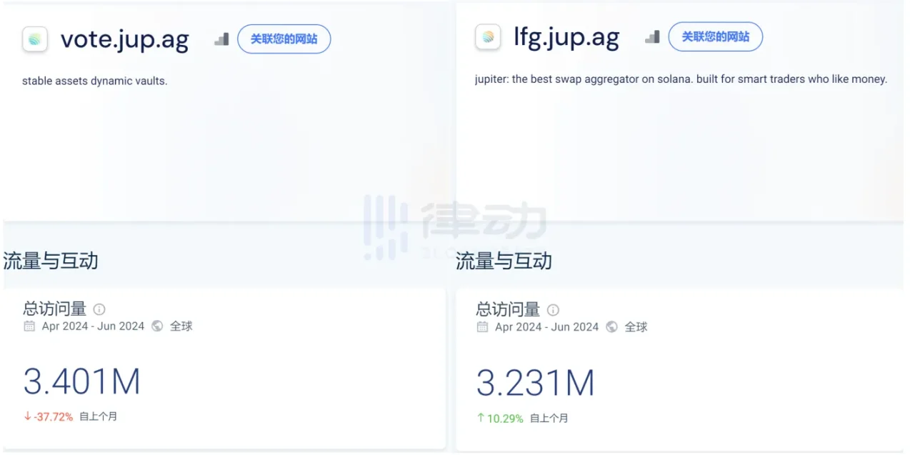 在精心运营维护下,Jupiter 打造出了一个繁荣热闹的社区。据 similarweb 数据,Jupiter 的所有社交流量中,Twitter 占了 66.25%。从整体上看,Jupiter 的社交流量占网站流量 3.49%,相比同样被称为 Solana 新龙头的 Raydium,Jupiter 更能将社交媒体传播影响力转化为流量,且主要依靠 Twitter 传播。这也从侧面说明,Jupiter 与社区的互动联系更为紧密。