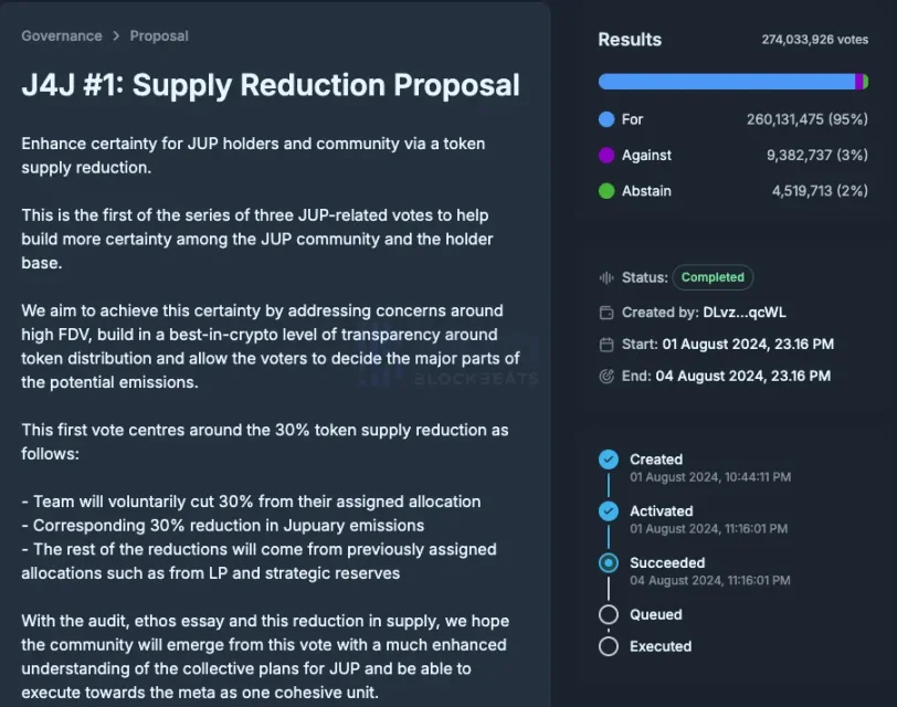 此外,为了进一步「贴近民心」,Jupiter 于 6 月中旬提出减少代币供应提案,且团队自愿从分配的代币中削减 30%,代币排放量相应减少 30%。其余的削减将来自之前分配的分配,例如有限合伙和战略储备。该提案于 8 月 1 日进行,仅半日就收集超 1.6 亿投票。最终以 95% 的人投票支持通过,并获得 2.74 亿票,创 DAO 投票率记录。