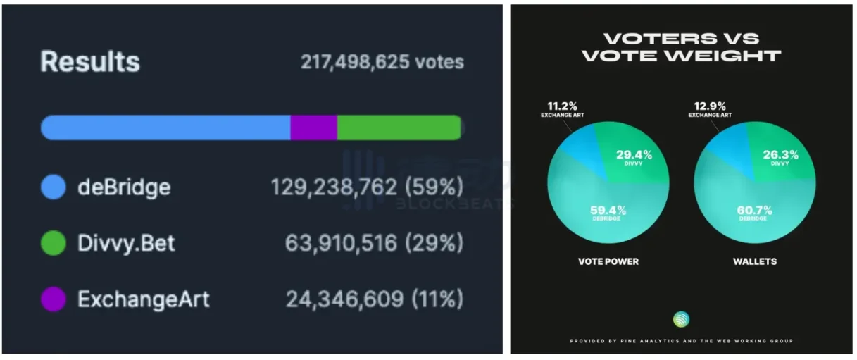 在第一个测试性提案通过后,Jupiter 立即举行了第一期 LFG Launchpad 投票,吸引了超 2 亿枚 JUP 投票。值得注意的是,在 Jupiter DAO 中,大众掌握的投票权与鲸鱼基本持平。根据 Jupiter 给出的 LFG 第 3 期的数据,投票权数据和独立投票钱包数据相当一致,获胜项目分别取得 59.4% 投票权与 60.7% 独立投票钱包数支持,数据接近。