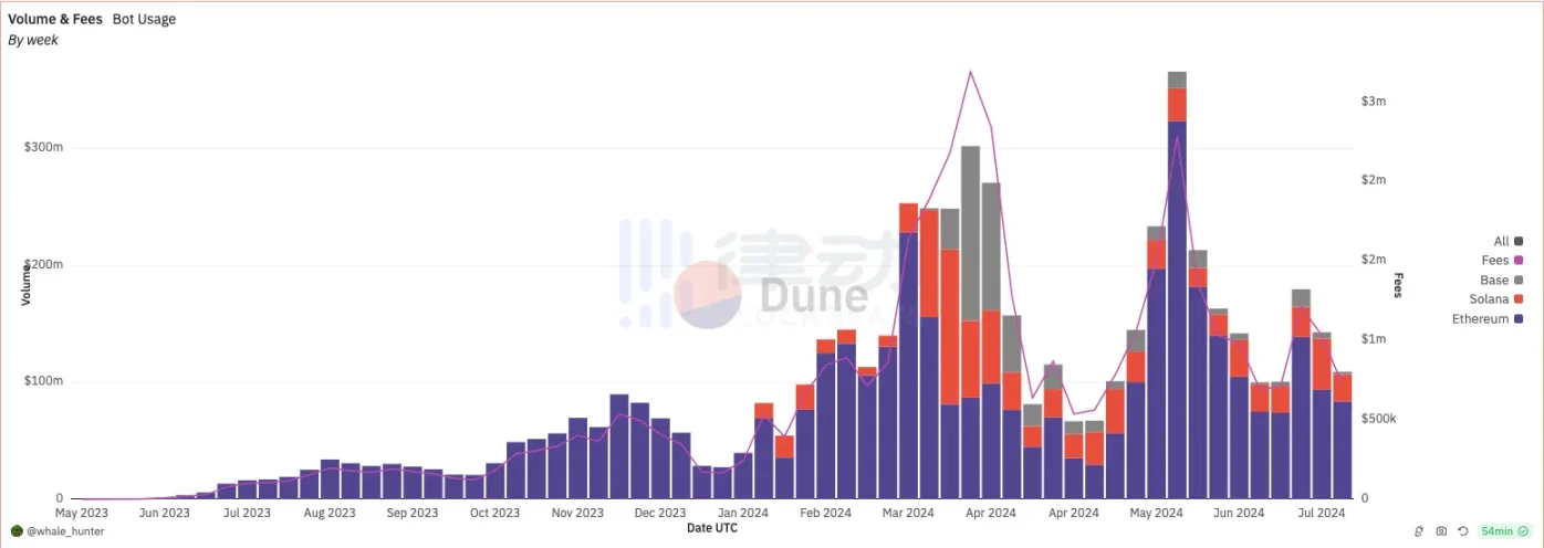 也正因为 meme 热潮越来越频繁,能够提供跟单交易、数据分析、资产跨链等功能的 TGBot 进一步打压了 DEX 市场。据 Dune 数据,Banana Gun 交易量在 meme 热潮期间实现了 50 亿美元的交易量,目前交易量已超 56 亿美元,平均每日交易量超 2300 万美元。