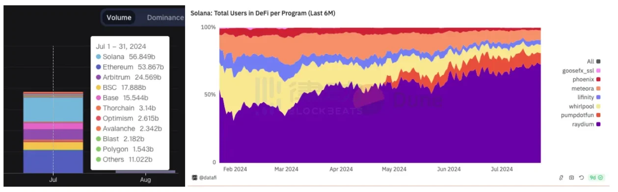 仅对比 DEX 赛道,Solana DEX 似乎稍有起色。据 Defillama 数据,7 月份 Solana 上的 DEX 交易量达 558.76 亿美元,而同期以太坊 DEX 交易量为 538.67 亿美元,这也意味着 Solana 上的 DEX 月度交易量在历史上首次超越以太坊。