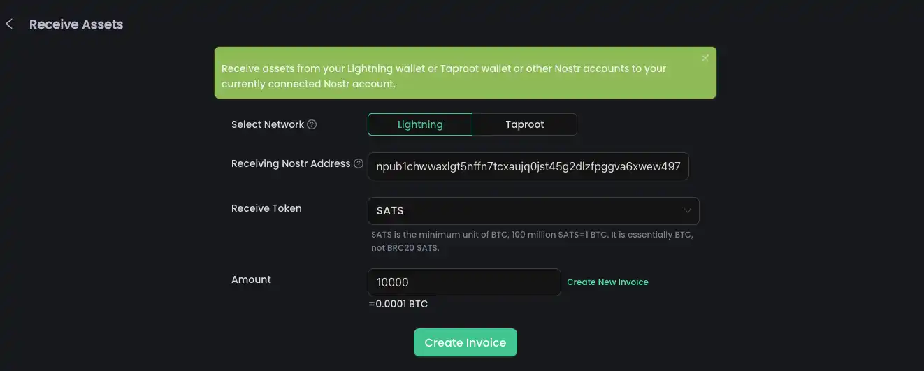 通过 Ably 钱包存款:如果使用 Ably 钱包,先向 Alby 钱包中充值资金,然后到Nostr 官网点击「Receive Assets」进入充值页,最少充值为 10000 sats,即 0.0001 BTC。